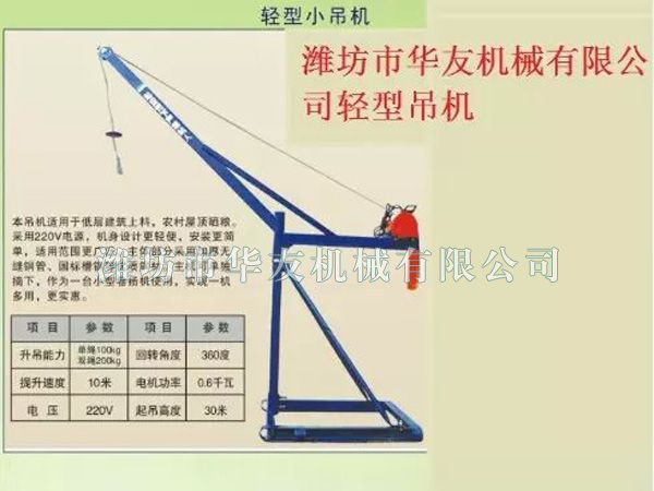 小型吊運機含電機含變速機【華友牌】便攜式吊運機體積小、重量輕,一個人自行車就能攜帶;它吊的高、速度快,30層樓房8分鐘就能打來回;它便于安裝,起重大,容易操作,效率高。它的問世是當(dāng)今建筑裝潢行業(yè)機械上料的重大突破,從此將結(jié)束高空裝潢材料依靠人工搬運的歷史。它為勞動者極大的減輕了勞動強度,較大地創(chuàng)造了經(jīng)濟效益;它投資小、見效快、零風(fēng)險、高回報。華友機械便攜式吊運機采用220伏單相電源,使用極為方便,是安裝公司以及搬運工人的實用小型機械。室內(nèi)吊運機體積小,重量輕,安裝方便,操作方便,性能優(yōu)良,是一種應(yīng)用極為廣泛的小型機械。而且速度快運行穩(wěn),操作靈活,減輕了搬運工人的勞動強度,提高了工作效率。