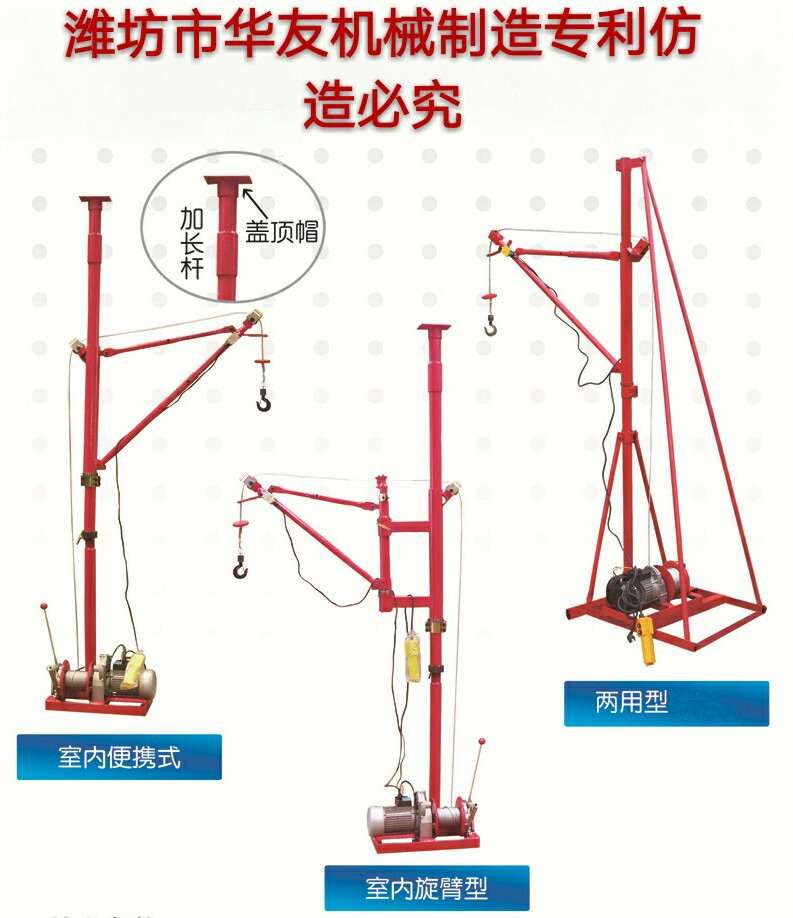 3、吊運(yùn)速度快 4秒提升1米,10層樓3分鐘就可打來(lái)回,配用“專(zhuān)用工具”吊運(yùn)速度驚人,并且樓層越高優(yōu)勢(shì)越大。 4、適用范圍廣 采用220伏單相電源,廣泛地應(yīng)用于多種行業(yè)和場(chǎng)所。如裝潢公司、吊運(yùn)公司、安裝公司、搬家公司、工廠車(chē)間、修理部門(mén)、倉(cāng)儲(chǔ)庫(kù)房等。還可安裝于戶(hù)內(nèi),房頂和大型工程工地。也可代替龍門(mén)吊用于小型建筑工程,如安裝防護(hù)網(wǎng)、廣告牌、樓頂防水現(xiàn)澆工程等;能修井、修泵,還能存入水果、曬糧等。