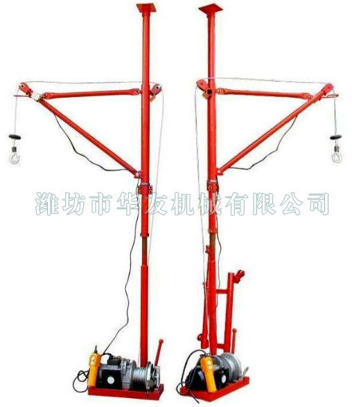 3、吊運速度快 4秒提升1米,10層樓3分鐘就可打來回,配用“專用工具”吊運速度驚人,并且樓層越高優(yōu)勢越大。 4、適用范圍廣 采用220伏單相電源,廣泛地應(yīng)用于多種行業(yè)和場所。如裝潢公司、吊運公司、安裝公司、搬家公司、工廠車間、修理部門、倉儲庫房等。還可安裝于戶內(nèi),房頂和大型工程工地。也可代替龍門吊用于小型建筑工程,如安裝防護網(wǎng)、廣告牌、樓頂防水現(xiàn)澆工程等;能修井、修泵,還能存入水果、曬糧等。